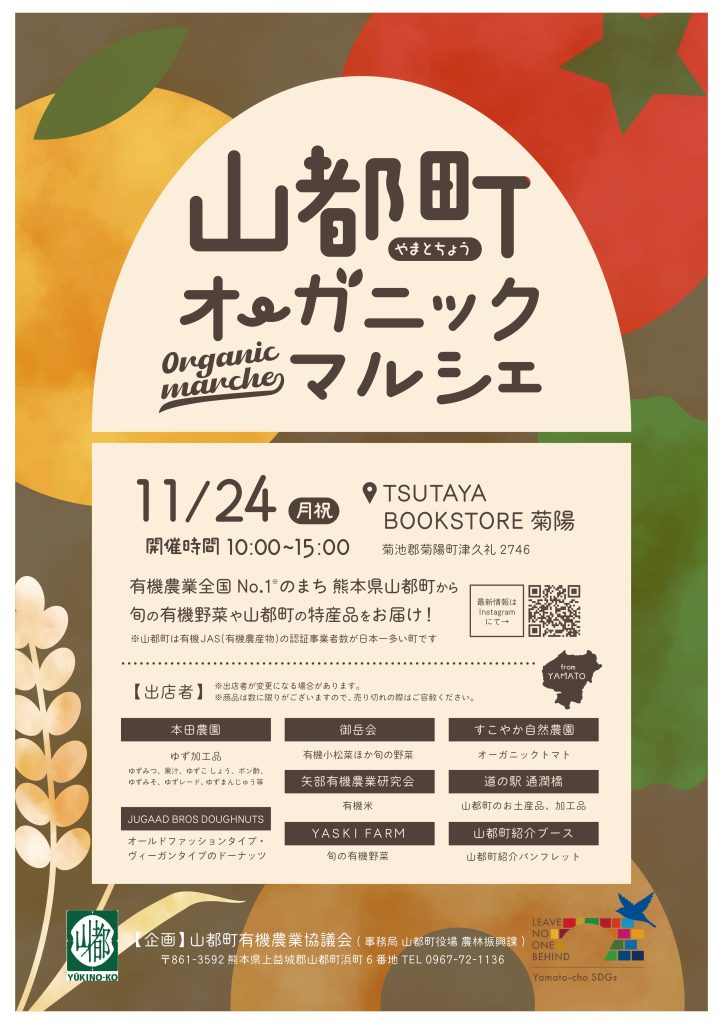 ニューコ・ワン株式会社(本社:熊本市中央区安政町1番2号 代表取締役社長:塩原 礼貴)は、山都町有機農業協議会(事務局:山都町役場 農林振興課)との合同企画「山都町オーガニックマルシェin TSUTAYA BOOKSTORE 菊陽」を2025年11月24日(月)に開催いたします。
