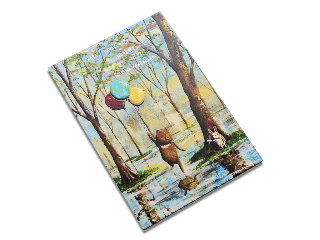 穏やかな空気が流れる森の中で、風船を手に今にも浮かんでしまいそうなくまさん。その隣には、それをやさしく見守るうさぎさんが寄り添います。これから空へと舞い上がるような一瞬を、ふたりの存在が際立つように丁寧に立体化しました。透き通った美しい水面の揺らぎが、こちらにまで伝わってくるような、不思議で温かい世界を閉じ込めたポストカードです。