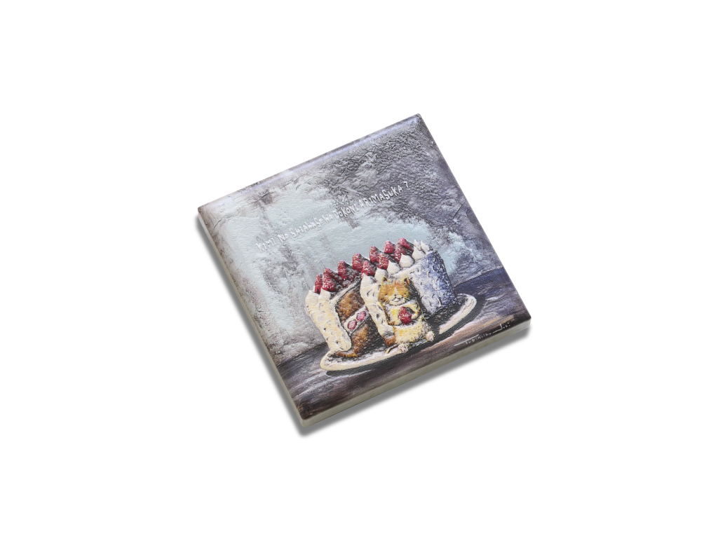 大きなショートケーキの前で、猫がいちごを手にやさしくほほえんでいます。ケーキの層やクリームのなめらかな質感、いちごの粒感を微細な凹凸で表現しました。背景のコンクリート壁には、荒めの起伏を加えて、ケーキの甘やかさと壁の無機質さという対照的な存在が溶け合う、作品の世界観をそのままマグネットの中に凝縮しました。日常の中にある「幸せの場所」を思い出させてくれるマグネットです。