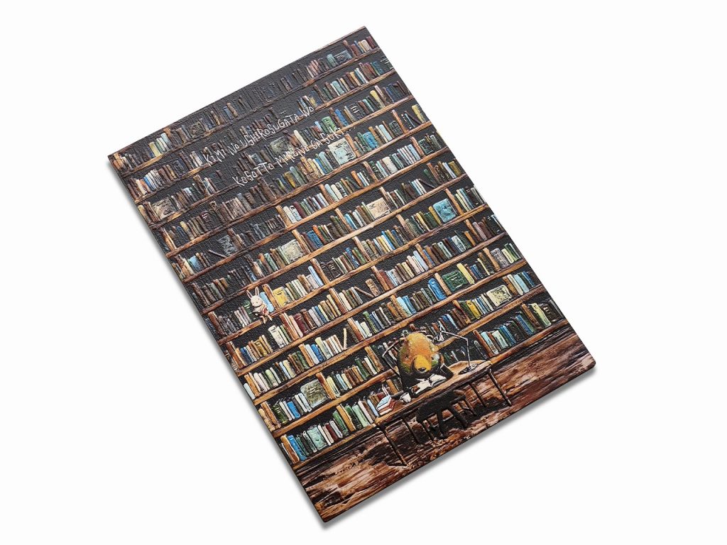日差しがやわらかく差し込む大きな本棚の前で、静かに読書を楽しむくまさん。やわらかな光と影のコントラストが、穏やかな午後のひとときを感じさせます。本棚に並ぶ一冊一冊の背表紙に凹凸のアレンジを施し、指先でそっとなぞりたくなるような質感と空気感を表現しました。空間に漂う陰影と光の揺らぎまでも感じられる、物語の世界に没入できるポストカードです。