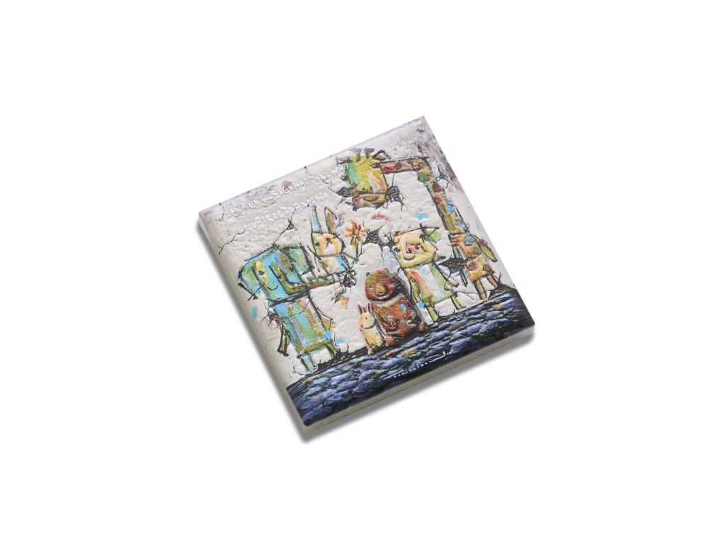 少しぼろぼろになった壁に、くまさんとうさぎさんが新しい絵を描いたのでしょうか。筆を手に、並んで座るふたりの姿は、まるで心をやさしく塗り替えているようです。壁のひび割れ部分を少しへこませることで、リアルに近い質感を表現し、絵の具の重なりや筆のタッチに微細な凹凸を加えて立体的に仕上げました。塗り重ねた色の奥行きが、やさしく心に響くマグネットです。