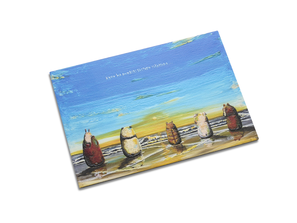 朝日が昇る砂浜に、動物たちが並んで座り、静かに海を眺めています。今日はがんばりすぎなくてもいいよ――そんな声が聞こえてきそうな、ほっとする後ろ姿です。中央に差し込む朝日の光や、打ち寄せる波の質感にあわせて微細な凹凸を施しています。動物たちのまあるいシルエットも、光を受けてやさしく浮かび上がります。疲れた心に寄り添う、癒しのポストカードです。