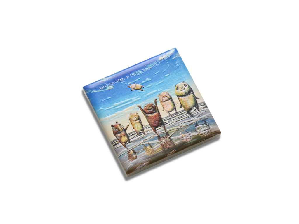 海辺のきらめく波を背に、動物たちが一斉にジャンプ!くまさんは、うさぎさんを高く飛ばそうと元気いっぱい。小さな水しぶきや、水鏡に映る動物たちの揺らめく姿の細部まで、微細な凹凸加工を施し、立体的に表現しました。さらに、空に浮かぶ雲の部分をぷっくりと仕上げ、青い空の奥行きと浮遊感を加えています。前向きな明るいエールを届けるマグネットです。